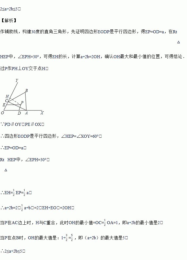 如图,已知∠XOY=60°,点A在边OX上,OA=2.过点A作AC⊥OY于点C,以AC为一边在∠XOY内作等边三角形ABC,点P是△ABC围成的区域(包括各边)内的一点,过点P作PD∥OY交OX于点D,作PE∥OX交OY于点E.设OD=a,OE=b,则a+2b的取值范围是_____.