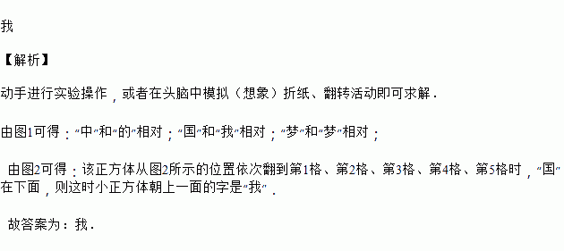 图1是一个正方体的展开图,该正方体从图2所示的位置依次翻到第1格、第2格、第3格、第4格、第5格,此时这个正方体朝上一面的字是_____.