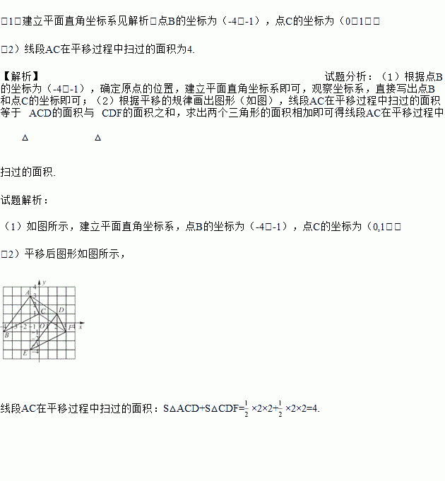 (2)将△ABC先向下平移2个单位长度,在向右平移3个单位长度,得到△DEF,请在图中画出△DEF,并求出线段AC在平移过程中扫过的面积.