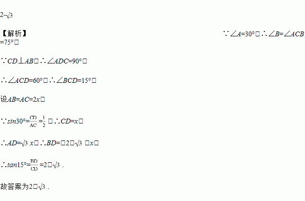 如图,在顶角为30°的等腰三角形ABC中,AB=AC,若过点C作CD⊥AB于点D,则∠BCD=15°.根据图形计算tan15°=____