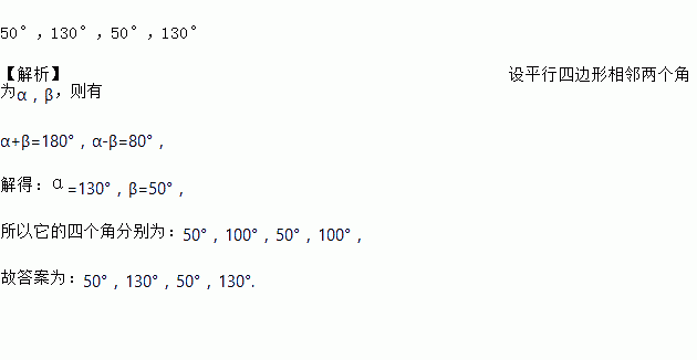 已知在□ABCD中,一组邻角的差为80°则它的四个内角分别为__________________.