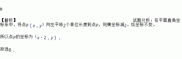 B 【解析】试题分析:在平面直角坐标系中,将点P(x,y)向左平移2个单位长度到点P,则横坐标减2,纵坐标不变, 所以点P的坐标为(x﹣2,y), 故选B.