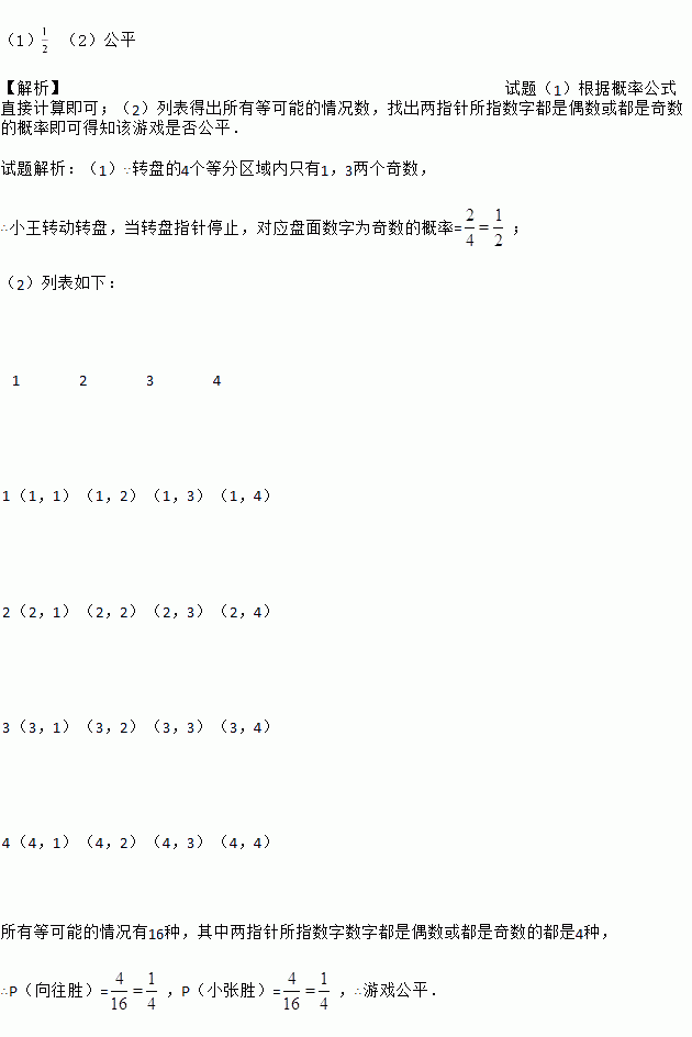 由于只有1张市运动会开幕式的门票,小王和小张都想去,两人商量采取转转盘(如图,转盘盘面被分为面积相等,且标有数字1,2,3,4的4个扇形区域)的游戏方式决定谁胜谁去观看.规则如下:两人各转动转盘一次,当转盘停止转动时,如两次指针对应盘面数字都是奇数,则小王胜;如两次指针对应盘面数字都是偶数,则小张胜;如两次指针对应盘面数字是一奇一偶,则视为平局.若为平局,继续上述游戏,直至分出胜负.