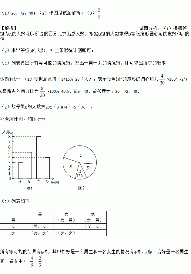 (3)组委会决定从本次比赛中获得A等级的学生中,选出2名去参加市中学生演讲比赛,已知A等级中男生有1名,请用“列表”或“画树状图”的方法求出所选2名学生中恰好是一名男生和一名女生的概率.