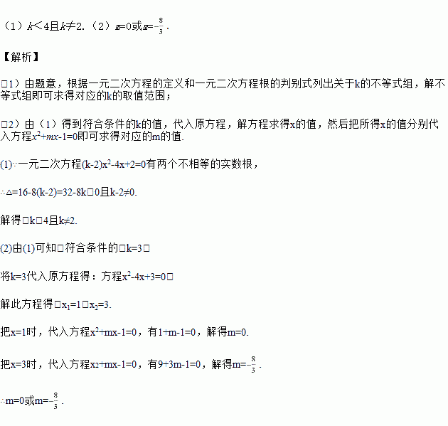 (2)如果k是符合条件的最大整数,且一元二次方程x2-4x+k=0与x2+mx-1=0有一个相同的根,求此时m的值.