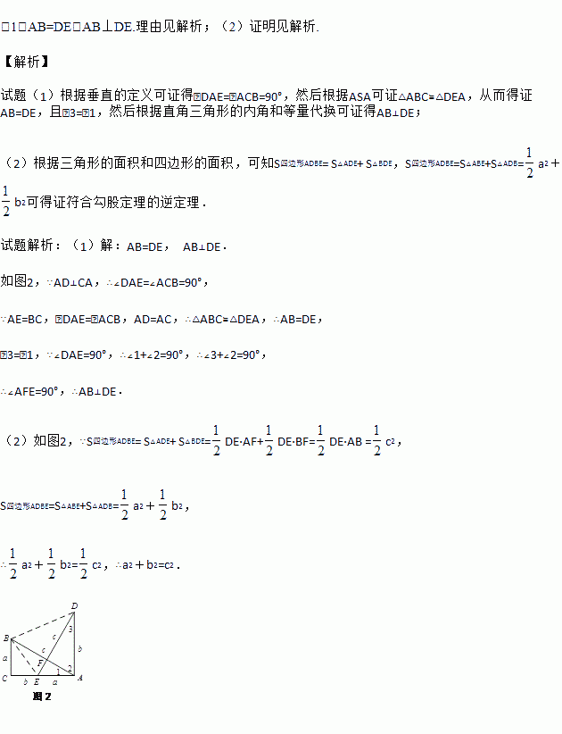 如图,在Rt△ABC中,∠ACB=90°,E为AC上一点,且AE=BC,过点A作AD⊥CA,垂足为A,且AD=AC,AB、DE交于点F(1)判断线段AB与DE的数量关系和位置关系,并说明理由(2)连接BD、BE,若设BC=a,AC=b,AB=c,请利用四边形ADBE的面积证明勾股定理.