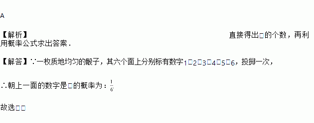 抛掷一枚质地均匀的立方体骰子一次,骰子的六个面上分别标有数字1,2,3,4,5,6,则朝上一面的数字为2的概率是( )