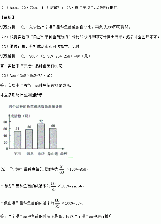 (1)60尾.(2)72尾;补图见解析;(3)选“宁港”品种进行推广. 【解析】 试题分析:(1)先求出“宁港”品种鱼苗数的百分比,再乘以300即可得解; (2)根据实验中“甬岱”品种鱼苗数的百分比和成活率即可计算出结果;然后补全图形即可; (3)通过计算、分析成活率即可选择推广品种. 试题解析:(1)300×(1-30%-25%-25%)=60(尾) 答:实验...