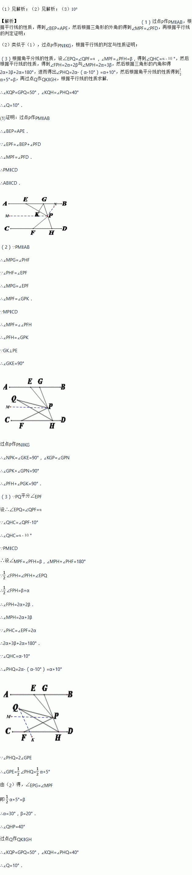 ∠FPH=∠PFH+∠EPQ,当∠PHQ=2∠GPE时,∠QHC=∠QPF-10,求∠Q的度数.![]()