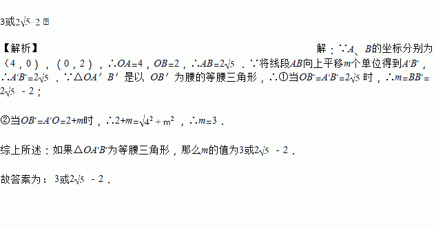 如图,在直角坐标系中,点 A、B 的坐标分别为(4,0),(0,2),将线段 AB 向上平移 m个单位得到 A′B′,连接 OA′.如果△OA′B′是以 OB′为腰的等腰三角形,那么 m 的值为_______.