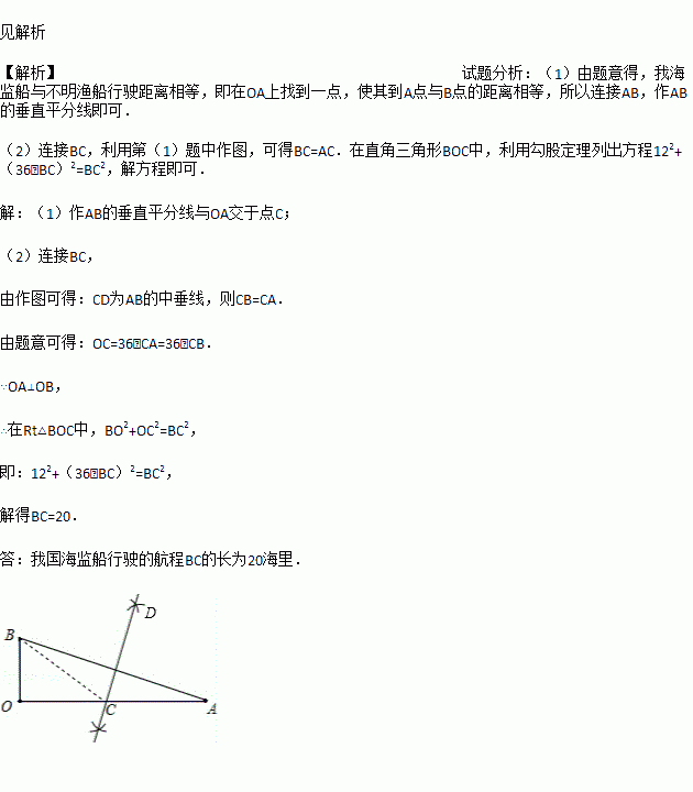中菲黄岩岛争端持续,我海监船加大黄岩岛附近海域的巡航维权力度.如图,OA⊥OB,OA=36海里,OB=12海里,黄岩岛位于O点,我国海监船在点B处发现有一不明国籍的渔船,自A点出发沿着AO方向匀速驶向黄岩岛所在地点O,我国海监船立即从B处出发以相同的速度沿某直线去拦截这艘渔船,结果在点C处截住了渔船.