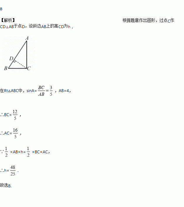 在Rt△ABC中,∠C=90°,若AB=4,sinA=,则斜边上的高等于( )