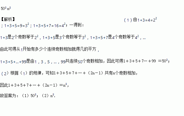 观察等式:1+3=4=22,1+3+5=9=32 ,1+3+5+7=16=42 ,1+3+5+7+9=25=52 ,……