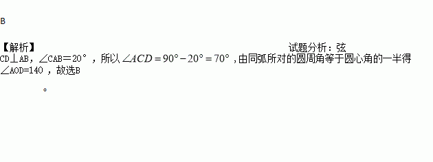 如图,线段AB是⊙O的直径,弦CD⊥AB,∠CAB=20°,则∠AOD等于( )