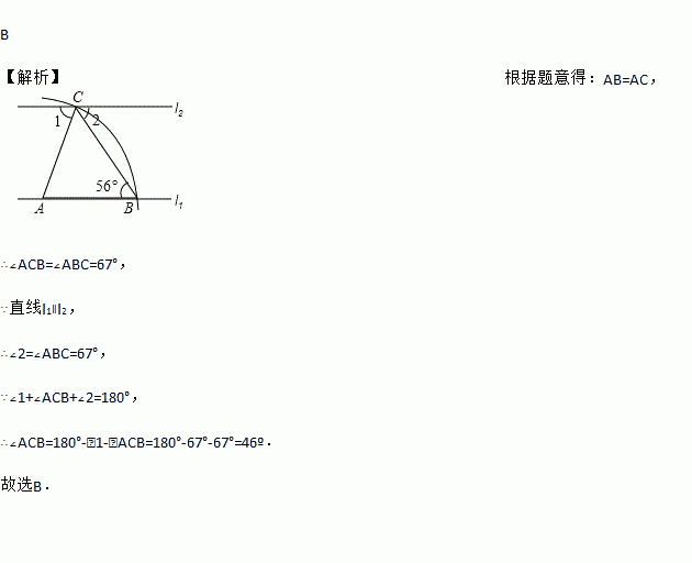 如图,直线l1∥l2,以直线l1上的点A为圆心、适当长为半径画弧,分别交直线l1、l2于点B、C,连接AC、BC.若∠ABC=67°,则∠1=( )