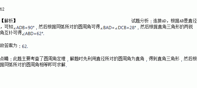 如图,AB是⊙O的直径,C,D是⊙O上的两点,若∠BCD=28°,则∠ABD=_____°.