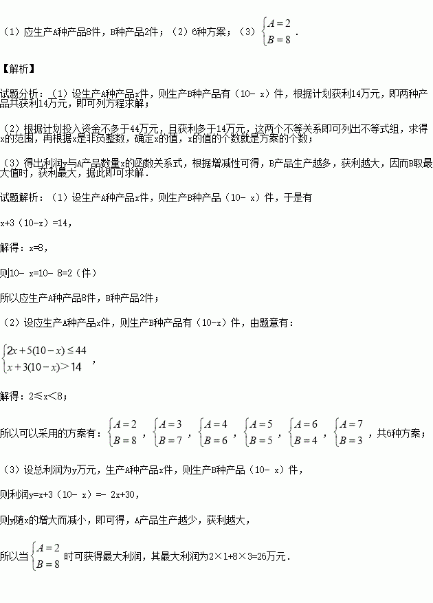 (2)若工厂计划投入资金不多于44万元,且获利多于14万元,问工厂有哪几种生产方案?