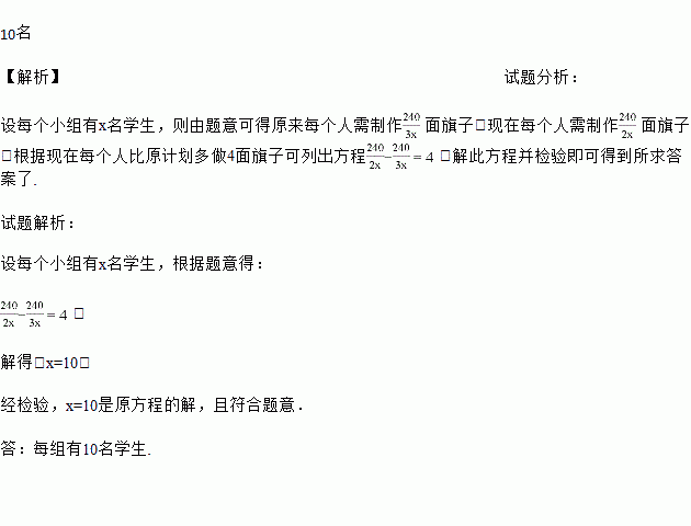为了迎接市中学生田径运动会,计划由某校八年级(1)班的3个小组制作240面彩旗,后因一个小组另有任务,改由另外两个小组完成制作彩旗的任务.这样,这两个小组的每个同学就要比原计划多做4面彩旗.如果这3个小组的人数相等,那么每个小组有多少名学生?
