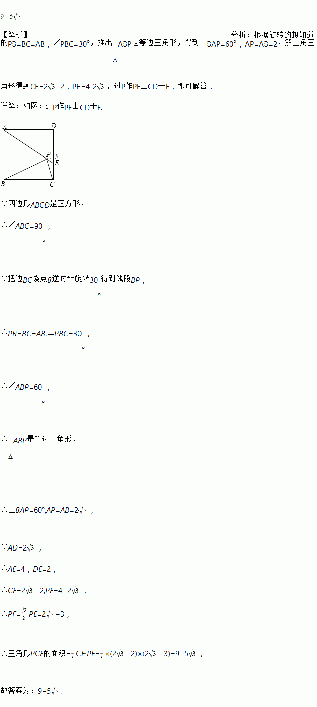 如图,在正方形ABCD中,AD=,把边BC绕点B逆时针旋转30°得到线段BP,连接AP并延长交CD于点E,连接PC,则三角形PCE的面积为____________.