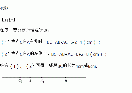 已知线段AB=6 cm,在直线AB上画线段AC=2 cm,则BC的长是_____cm.