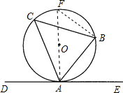 分析:首先过点O作直径AF,连接BF,根据同弧所对的圆周角相等可得∠C=∠AFB,进而可得到∠BAE=∠F,再根据直径所对的圆周角是90°,可证出∠AFB+∠BAF=90°,再利用等量代换可得∠BAE+∠BAF=90°,进而得到直线DE与⊙O相切.