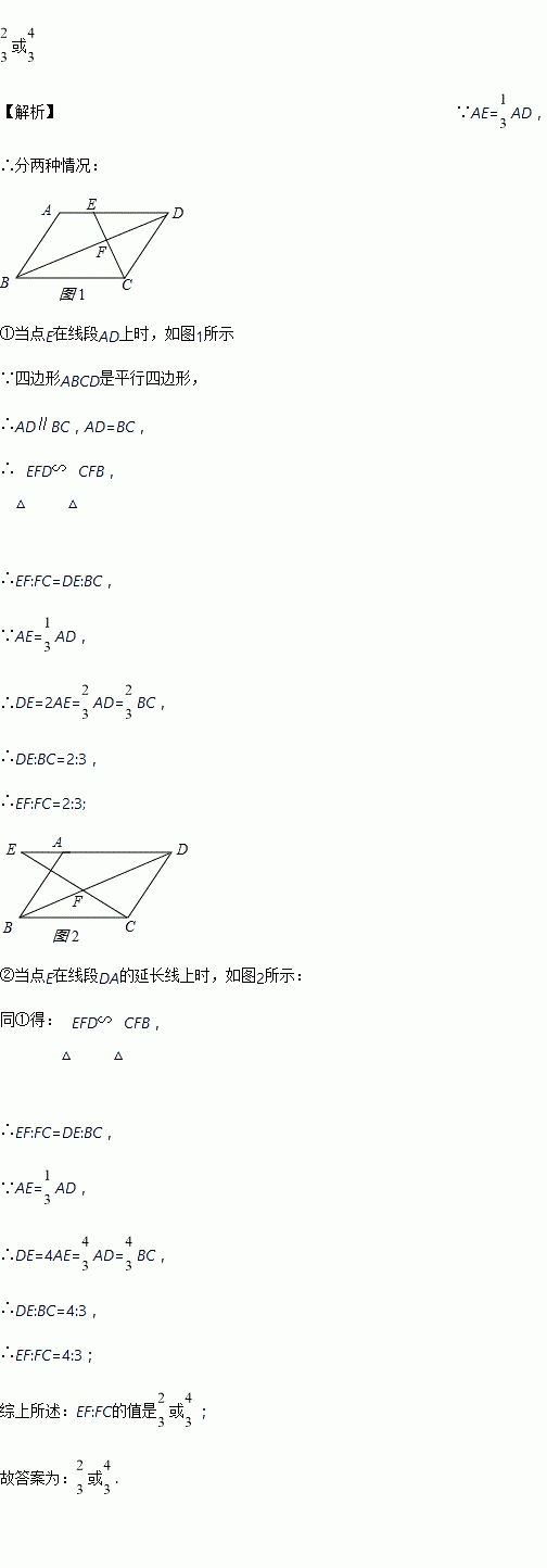 已知:在平行四边形ABCD中,点E在直线AD上,AE=AD,连接CE交BD于点F,则EF:FC的值是__.