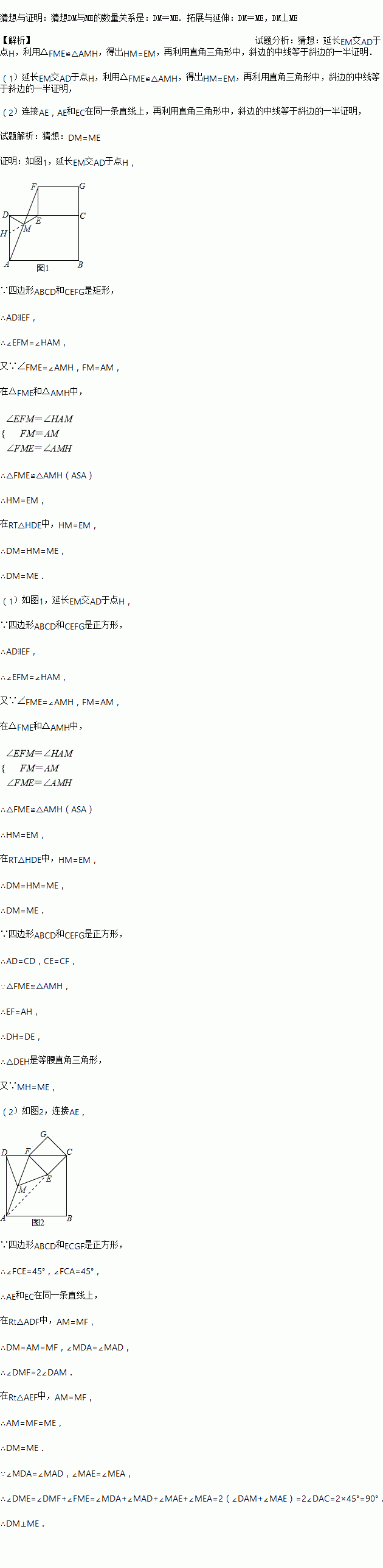 (1)若将“猜想与证明”中的纸片换成正方形纸片ABCD与正方形纸片ECGF,其他条件不变,则DM和ME的关系为__________________;