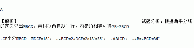 如图,AB∥CD,CE平分∠BCD,∠DCE=18°,则∠B等于( )