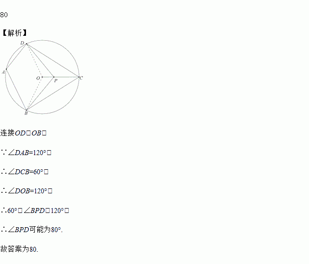 如图,四边形ABCD内接于⊙O,∠DAB=120°,连接OC,点P是半径OC上任意一点,连接DP,BP,则∠BPD可能为______度(写出一个即可).