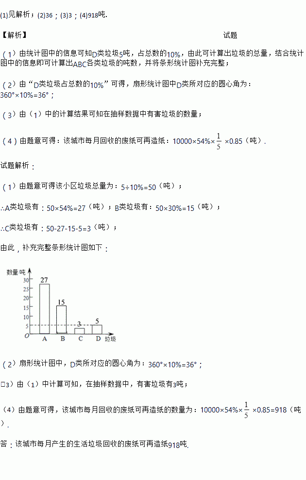 ,若每回收1吨废纸可再造纸0.85吨.假设该城市每月产生的生活垃圾为10000吨,且全部分类处理,那么每月回收的废纸可再造纸多少吨?