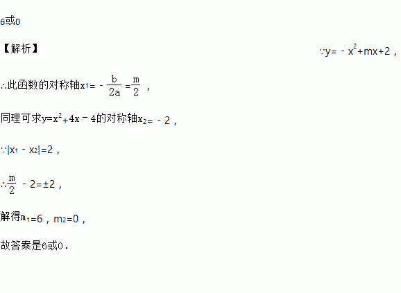 6或0 【解析】∵y=﹣x2+mx+2, ∴此函数的对称轴x1=﹣=, 同理可求y=x2+4x﹣4的对称轴x2=﹣2, ∵|x1﹣x2|=2, ∴﹣2=±2, 解得m1=6,m2=0, 故答案是6或0.