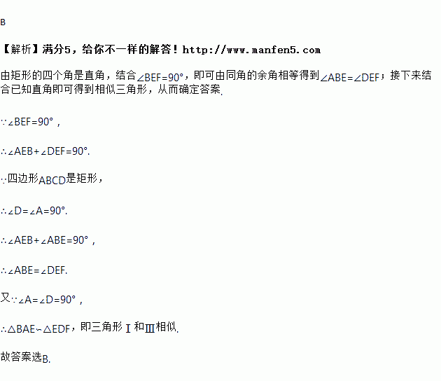 矩形ABCD中,点E、F分别在AD、CD上,且∠BEF=90º,则三角形Ⅰ,Ⅱ, Ⅲ,Ⅳ一定相似的是 ( ).