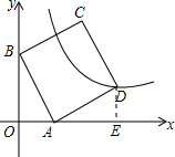分析 (1)过D作DE垂直于x轴,由A与B的坐标求出OA与OB的长,根据四边形ABCD为正方形,得到AB=AD,且∠BAD为直角,利用同角的余角相等得到一对角相等,利用AAS得到三角形OAB与三角形EDA全等,由全等三角形的对应边相等得到AE=OB=2,DE=OA=1,求出OE的长,确定出D坐标,代入反比例解析式求出k的值即可确定出解析式;