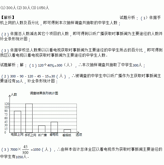 (3)若本区共有中学生7000人,请你估计我区以看电视以看电视获取时事新闻为主要途径的中学生有多少人?