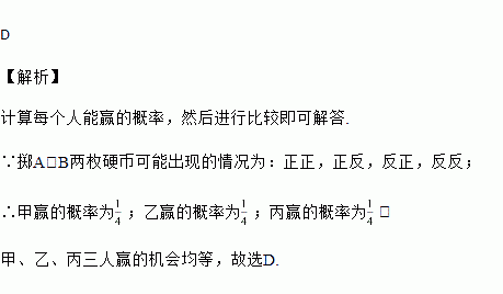 币反面,丙赢.在这个游戏中,谁赢的机会最大( )![]()