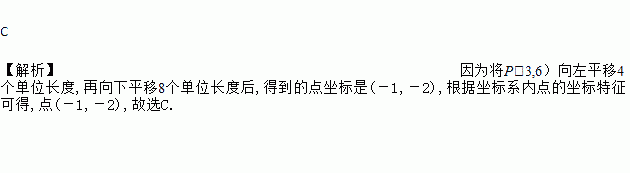 C 【解析】因为将P(3,6)向左平移4个单位长度,再向下平移8个单位长度后,得到的点坐标是(-1,-2),根据坐标系内点的坐标特征可得,点(-1,-2),故选C.