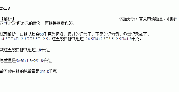 五袋白糖以每袋50kg为标准,超过的记为正,不足的记为负,称量记录如下:+4.5,-4,+2.3,-3.5,+2.5.这五袋白糖共超过多少kg?总重量是多少kg?