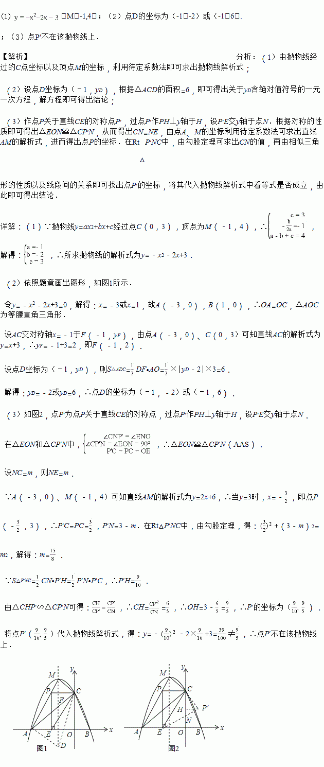 (3)点P在线段AM上,当PC与y轴垂直时,过点P作轴的垂线,垂足为E,将△PCE沿直线CB翻折,使点P的对应点P'与P、E、C处在同一平面内,请求出P'坐标,并判断点P'是否在抛物线上.![]()