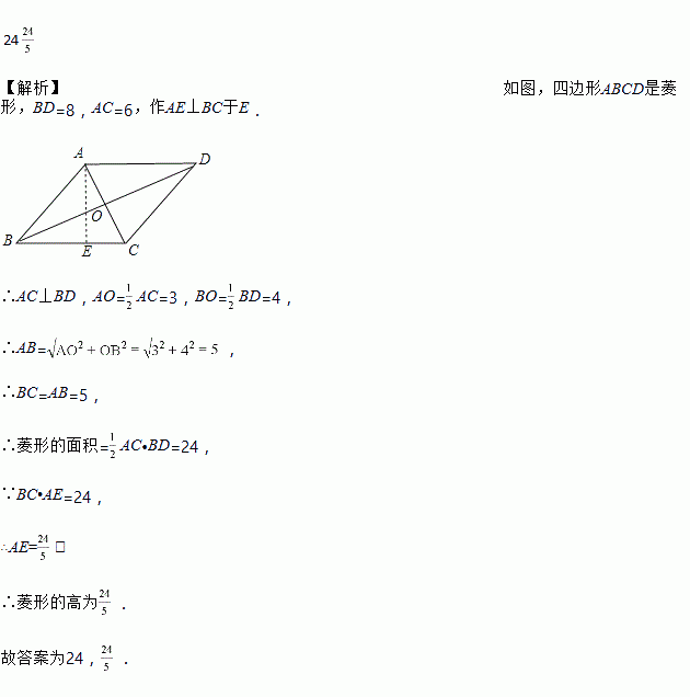 已知菱形的两条对角线长为8和6,那么这个菱形面积是________,菱形的高________.