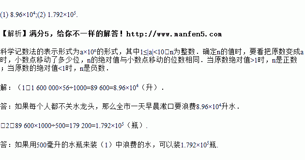 为节约水资源,某初中环保宣传小组作了一个调查,得到了如下的一组数据:全市大约有160万人,每天早晨起来漱口,如果漱口时都不关水龙头,那么每个人漱口时要浪费56毫升的水.