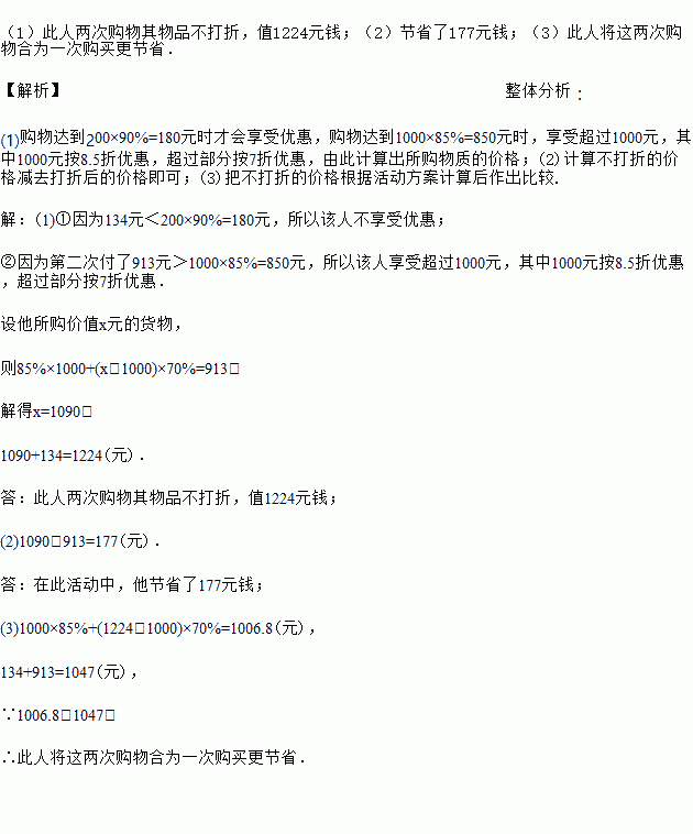(1)此人两次购物其物品如果不打折,值多少钱?