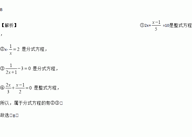 有下列方程:①2x+=10;②x-;③;④.属于分式方程的有( )