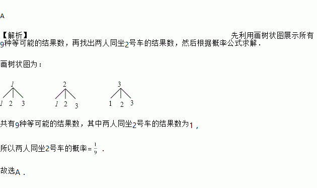 某校组织九年级学生参加中考体育测试,共租3辆客车,分别编号为1、2、3,李军和赵娟两人可任选一辆车乘坐,则两人同坐2号车的概率为