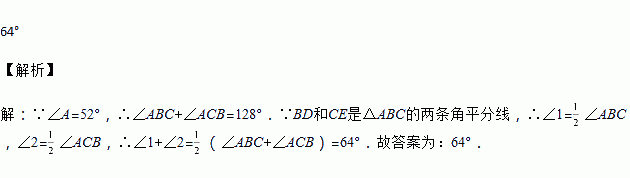 如图,在△ABC中,BD和CE是△ABC的两条角平分线.若∠A=52°,则∠1+∠2的度数为_______.