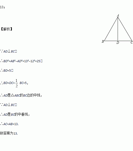 在△ABC中,AB =13,BC=10,AD⊥BC于D,且AD =12,则AC=____。