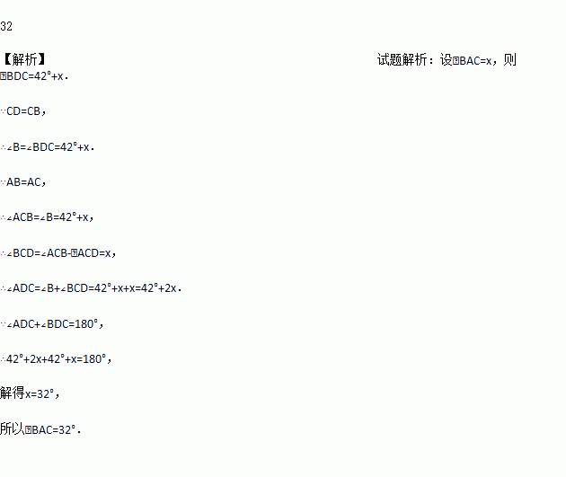 在△ABC中,AB=AC,CD=CB,若∠ACD=42°,则∠BAC=_____________°.