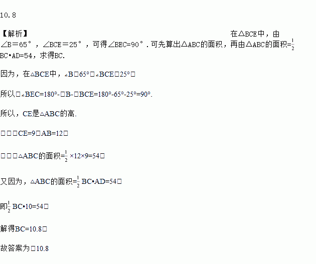 如图所示,E是△ABC中AB边上的一点,AD是△ABC的高,已知AD=10,CE=9,AB=12,∠B=65°,∠BCE=25°,求BC的长.