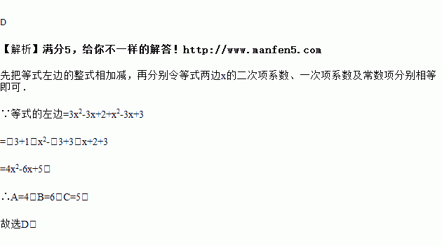 若(3x2-3x+2)-(-x2+3x-3)=Ax2-Bx+C,则A、B、C的值分别为( )