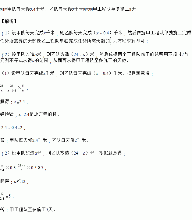 为迎接全国文明城市的评选,市政府决定对春风路进行市政化改造,经过市场招标,决定聘请甲、乙两个工程队合作施工,已知春风路全长24千米,甲工程队每天施工的长度比乙工程队每天施工长度的多施工0.4千米,由甲工程队单独施工完成任务所需要的天数是乙工程队单独完成任务所需天数的