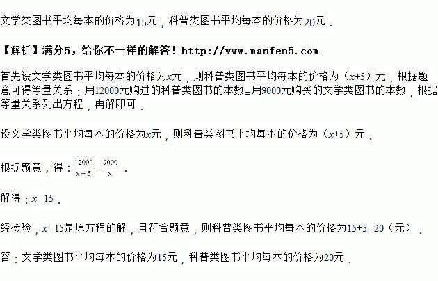 长春外国语学校为了创建全省“最美书屋”,购买了一批图书,其中科普类图书平均每本的价格比文学类图书平均每本的价格多5元.已知学校用12000元购买的科普类图书的本数与用9000元购买的文学类图书的本数相等,求学校购买的科普类图书和文学类图书平均每本的价格各是多少元?